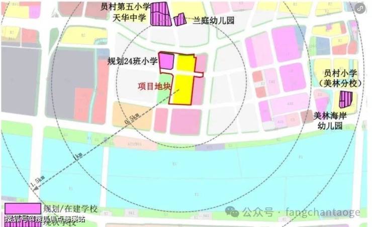 地块1.5公里范围内有员村第五小学、天华中学、兰庭幼儿园、员村小学(美林分校)、美林海岸幼儿园等。