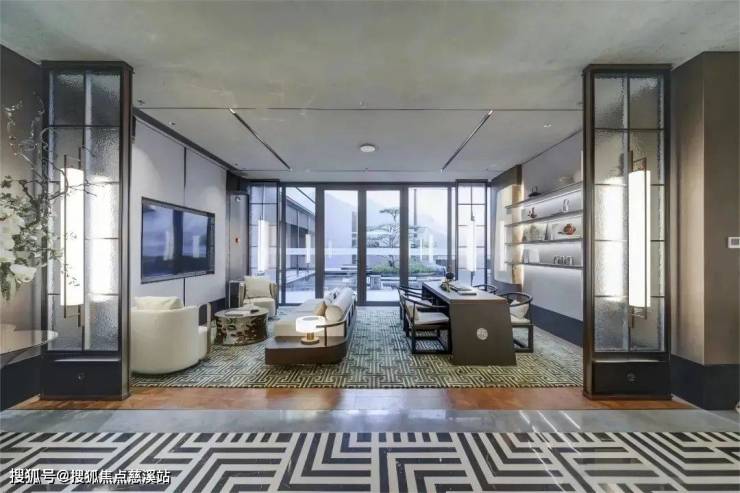 以法国灰仿石砖延伸至全景落地窗边缘,