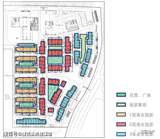 整体街区根据产品类型分别组团,自西向东依次布局1F商业产品、2F商业产品以及3F小面积段商业,天际线变化丰富,产品辨识度高。