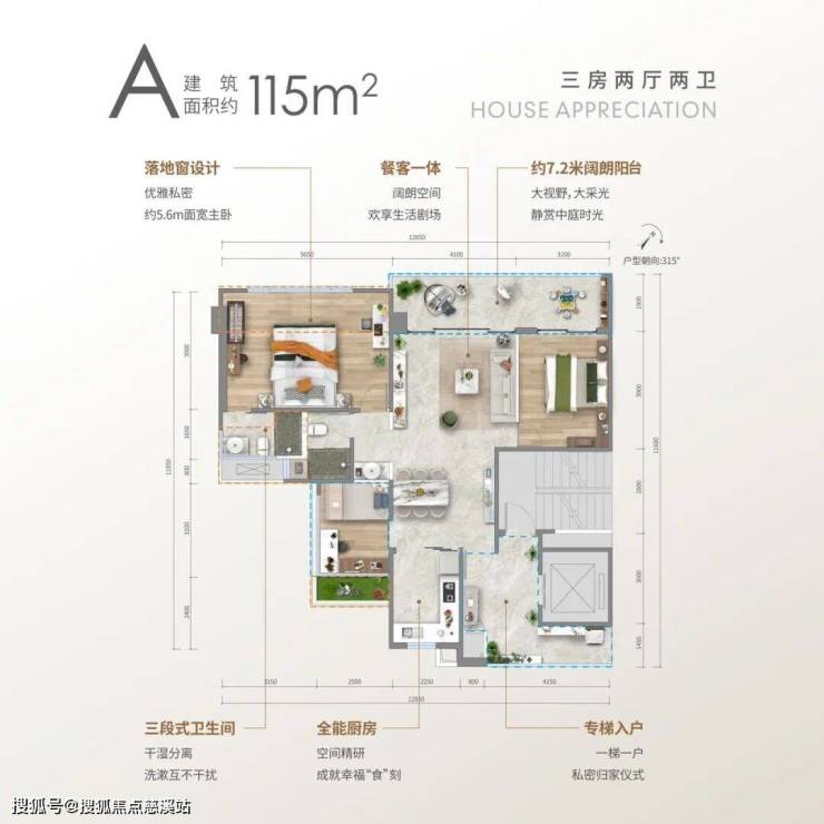 A户型: 约115㎡三房两厅两卫、层高22层