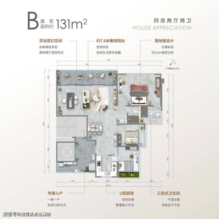 B户型: 约131㎡四房两厅两卫、层高23层
