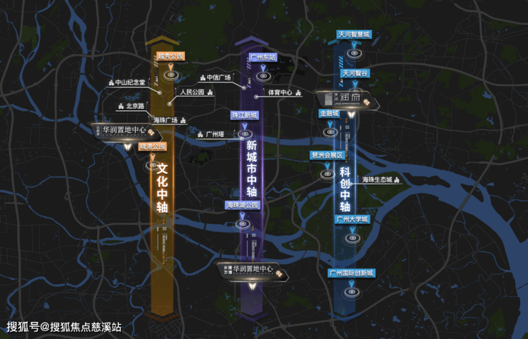 华润置地带着经验入驻广州,将多元业态与城市发展进行整合,并随规划先后布局三大中轴,助力广州城市格局升维