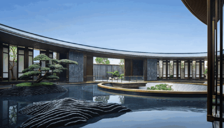 入门庭院营造“一池双松三山二十四节气”景观,24扇透光玉石屏风徐徐展开,约6米高的百年罗汉松接风迎客, “天圆地方”的流瀑庭院气度万千,可谓步步尊贵、处处风雅。