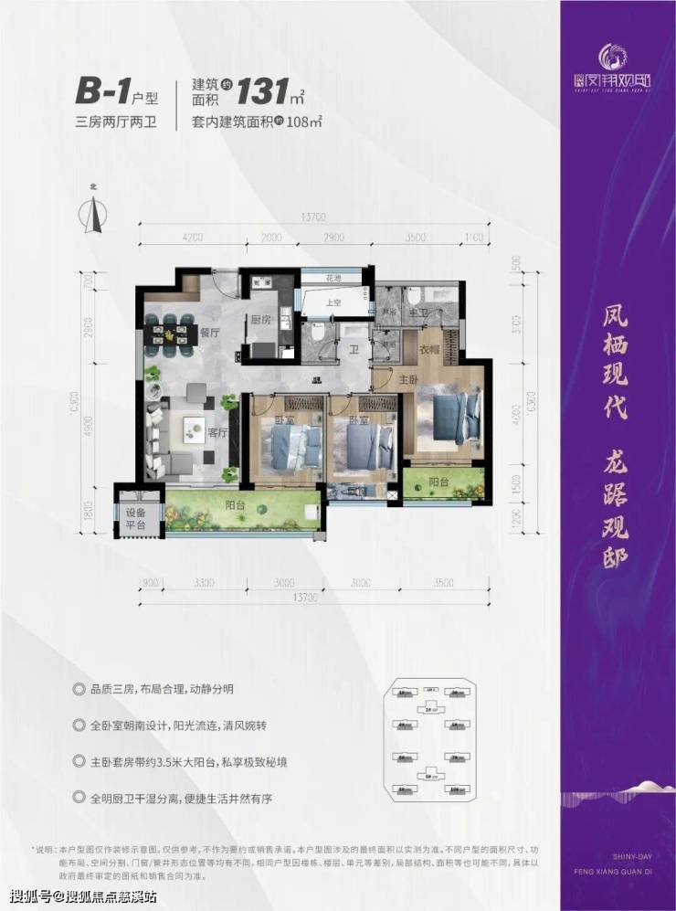 B-1 | 131㎡ | 3+2+2 | 主卧3.5m阳台 | 全卧朝南、干湿分离