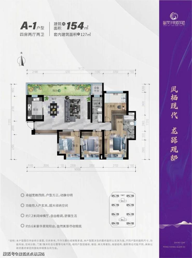 A-1 | 154㎡ | 4+2+2 | 7.2m横厅、9.6m阳台 | 方正动静分区、入户玄关