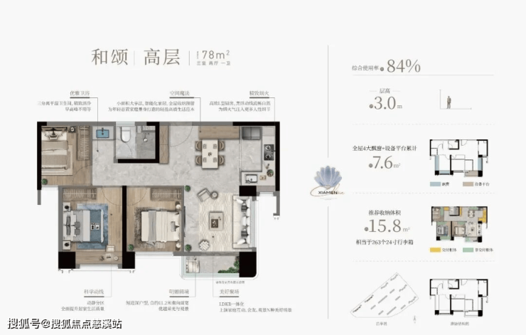 •78㎡刚需首选:通过飘窗、阳台赠送,实际使用能到 84%,还做了三卧室朝南,书房后期能改成婴儿房,对小家庭太友好;