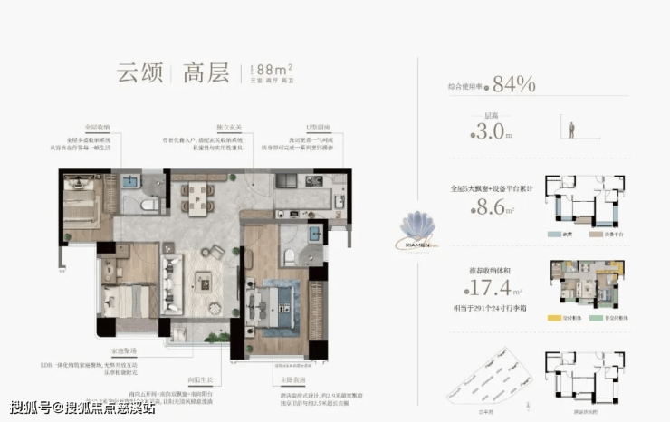 •89㎡明星户型:LDK 一体化设计让餐客厨形成 28㎡的核心区,双卫 + 独立家政间的配置,在同面积段里几乎找不到对手;