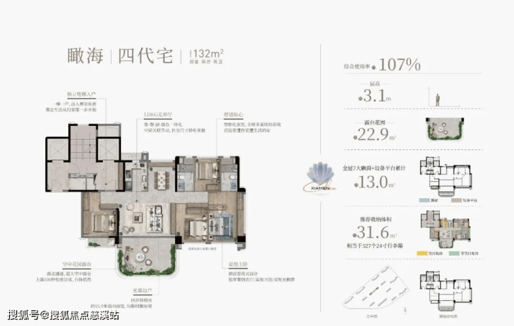 •132㎡改善顶配:使用率达到近110%,约15.9米南向巨幅面宽,宽5.7米厅能放下家庭影院,主卧带独立衣帽间和五星主卫,适合追求生活品质的二胎家庭。