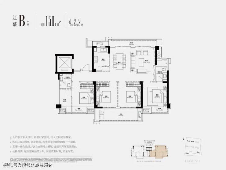 大师意志,艺术起笔。大师样板建面约150㎡特邀美国《室内设计》全球酒店室内设计第一的CCD香港郑中设计事务所操刀设计,两梯两户独立玄关,私享入户仪式,近46㎡LDKB一体化横厅,承载峯层家庭更多欢聚场景。约6.3米南北双阳台,配置约5.8米巨幕落地玻璃,四季美景揽入室内,近19㎡主人奢享套房,自成天地,尽显格局与尺度。大师样板建面约150㎡实景倾呈,诚邀藏家鉴赏。