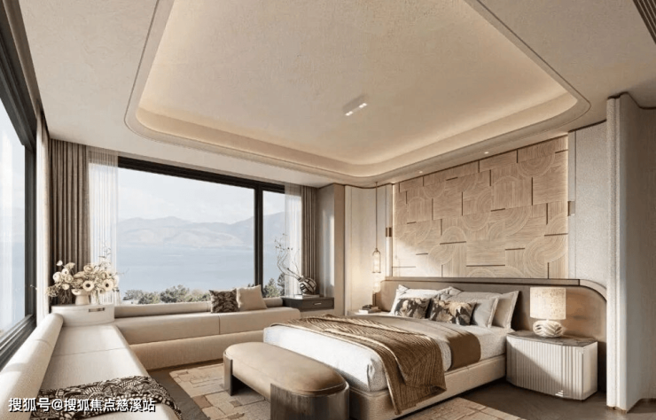 立面萃取山海意境,以玻璃+铝板线条勾勒度假美学,让建筑消隐于自然之中。两梯两户通透格局,确保户户视野开阔,实现视觉的无界延伸。