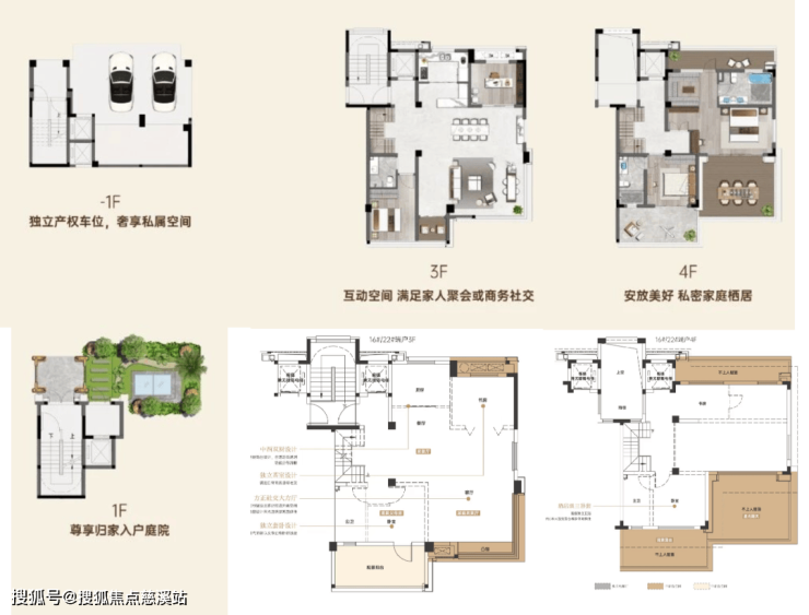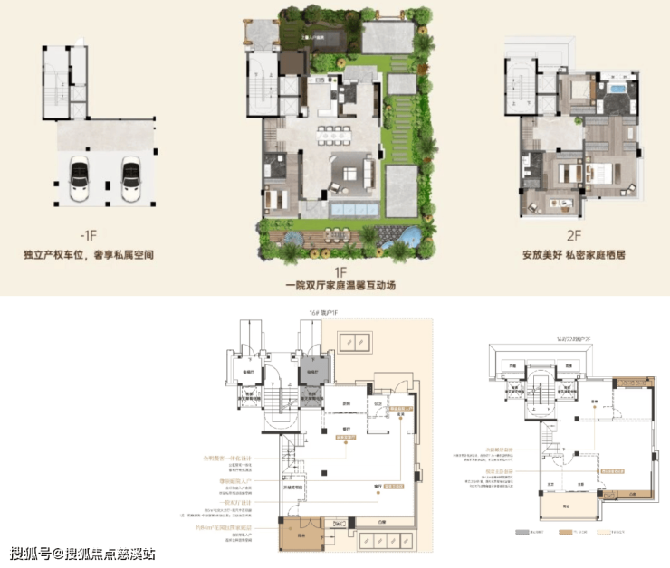 169平-上叠:独立的产权车位,加上1楼小型的入户庭院,在户内面积上,4楼有南北的不计容露台,无法做成室内使用,类似四代宅的赠送。