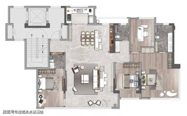149平:四房两厅三卫,同样的电梯设计,大面宽布局,主卧做了转角窗,公区面宽加大,四房设计,北向房间略小。