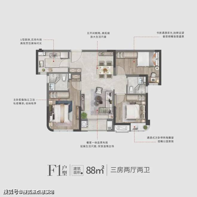 2. 建面约88平方米的F户型:这套户型朝向阳光,理解生活的美好。三房两厅两卫户型以南面五开间布局,最大化地实现通风和采光,让每个生活区域都能享受阳光的照耀。