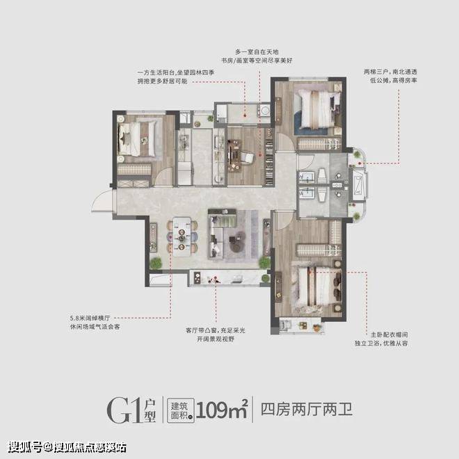 3. 建面约109平方米的G户型:这套四房两厅两卫户型拓展了生活空间,保证每个区域具有独立的功能性,并提高整体利用率,完全满足了二胎时代/三代同堂的居住需求。