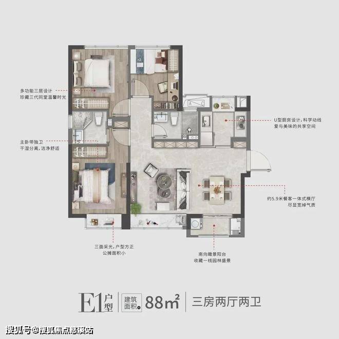 1. 建面约88平方米的E户型:该三房两厅两卫户型提供理想的居住空间,每个房间都有良好的采光和通风条件。朝南的瞰景阳台拥有宽敞的尺度,尽享开阔视野,推窗即可欣赏到绿色景观。