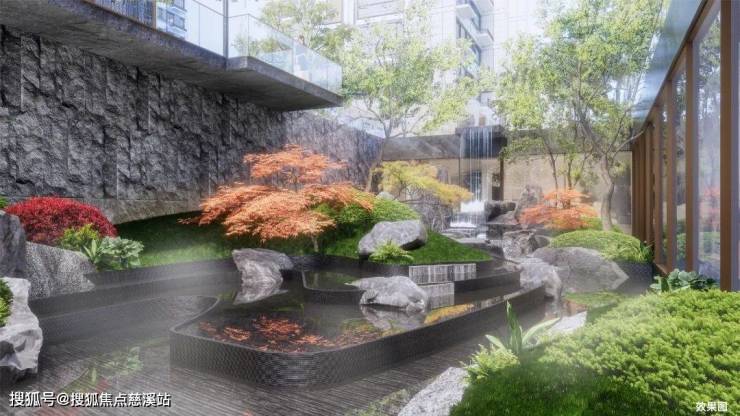 先来说说下沉庭院,其在1号楼和2号楼之间,打造了一个面积约360㎡的下沉庭院,采用了大量的石材,打造了叠水瀑布,里面栽种了5棵乌桕,成为天桥在园林景观上的一次创新引领。