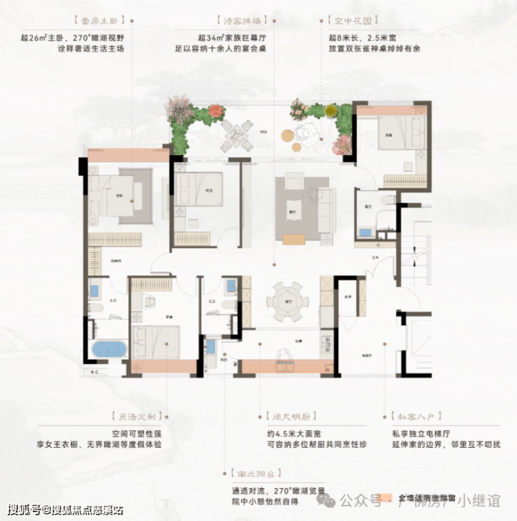 五花园:前庭后院,首创「五花园」式的设计满足长辈种花种菜的小爱好和儿孙玩闹的空间
