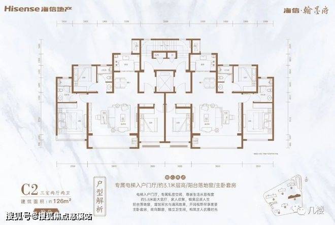 双开门电梯,电梯入户,大横厅+超大阳台也是目前市场高端置业的主流户型,搭配全景阳台落地窗,3.1米层高,相比较其他楼盘的同等户型,则更有优势。三室两厅两卫的布局,如果购房者有需求,也可以打造成四室。