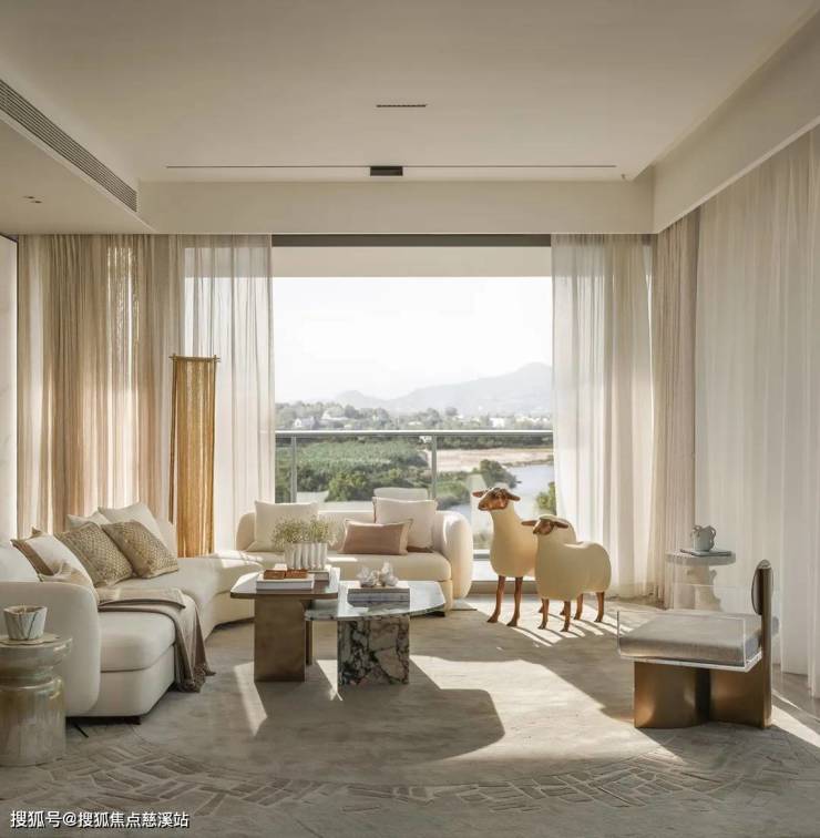 以全景视野,实现度假“自然共生”,中旅·馥棠公馆摒弃传统结构中的视觉阻隔,结合大扇系统门窗,将建筑转角转化为全景视窗。