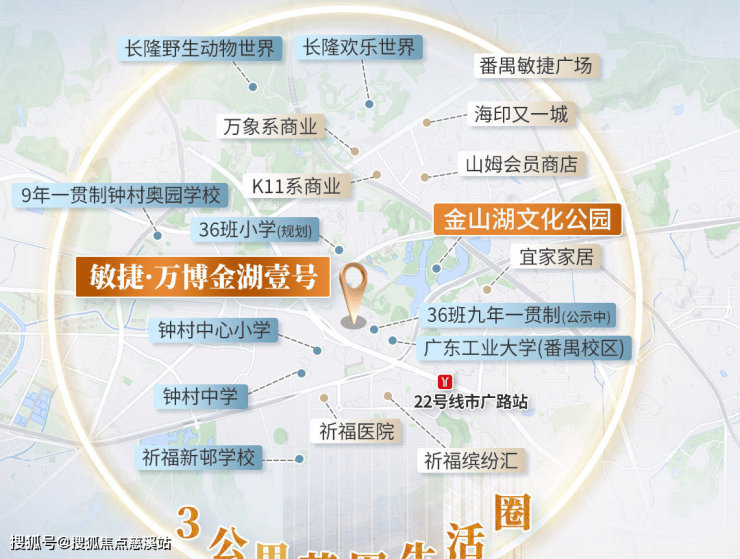 休闲——自带约13000㎡中央大花园,以一轴·两环·五核心·多花园;金山湖公园直线距离约400米步行可达,周边还有长隆乐园/长隆欢乐世界/香江野生动物园/水上乐园/大夫山森林公园等游玩胜地。
