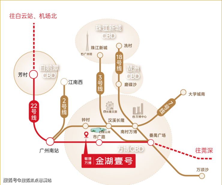 地铁——广州地铁22号线市广路站约900米,以及26号线(规划中)双地铁交汇,1站番禺广场、2站万博中心,3站琶洲CBD、4站珠江新城;周边还有7号线的钟村站,7号线和3号线交汇的汉溪长隆站可以到达;