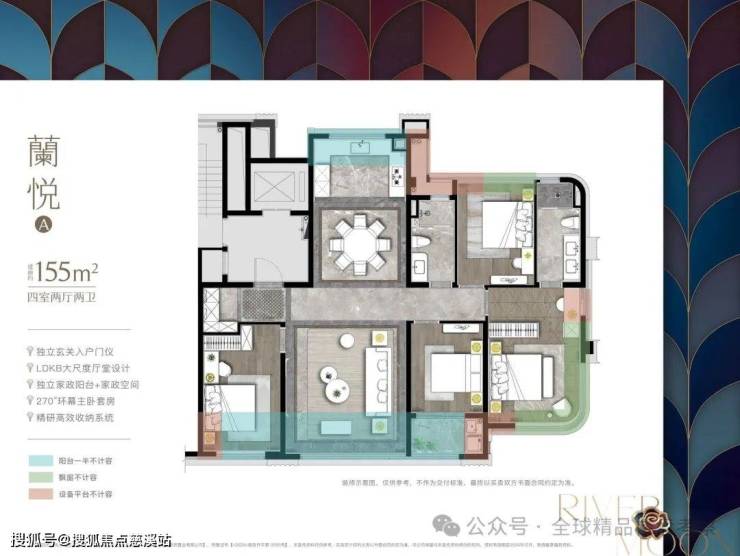 155 平米的户型,四开间朝南,采光通风极佳,独立的客餐厅设计,让空间更加规整,彰显了生活的仪式感。主卧依旧是亮点,270° 全景环幕视野,让业主躺在床上就能欣赏到窗外的美景,感受阳光的温暖。同时,主卧还配备了宽敞的衣帽间和双台盆洗漱区,空间尺度恰到好处,提升了居住的品质。