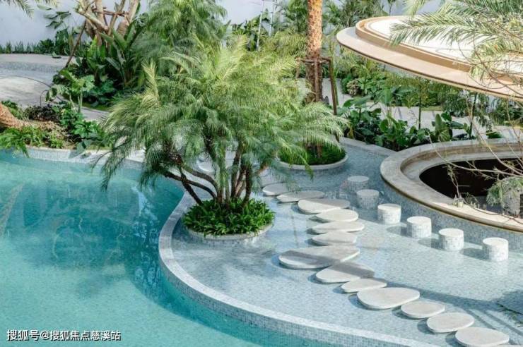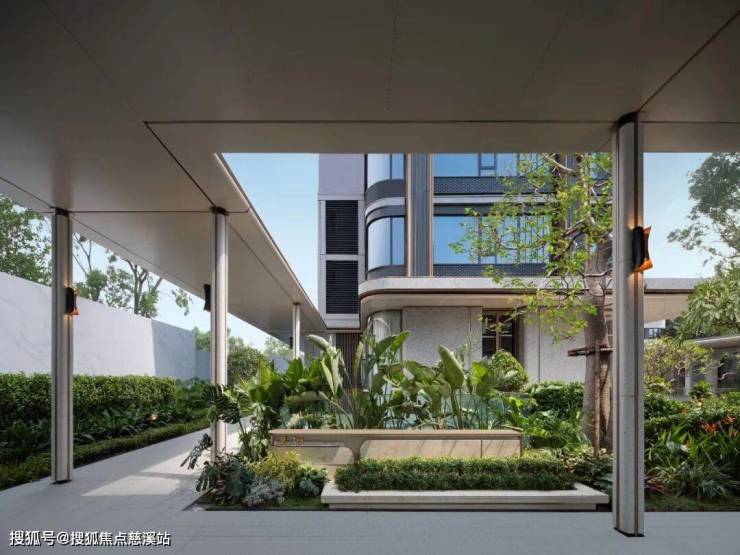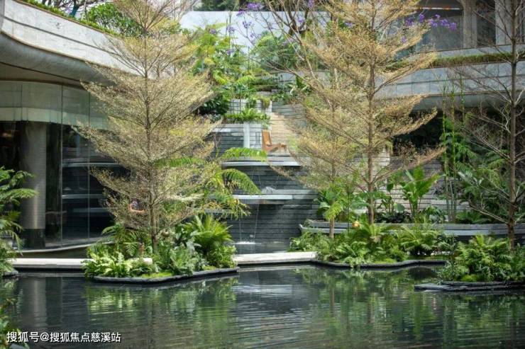 下沉式庭院以江南园林叠石手法,营造出平地起丘壑的立体场景,考虑到福州温暖湿润的亚热带季风气候类型,以锦叶榄仁为主树种,搭配蕨类等丰富多样的亚热带植物,构建高低错落,森系花园的大美意象,为四季生活增添惬意与美好。