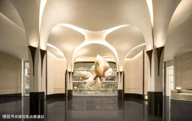 大堂入口雕塑以“白玉兰”为原型,以螺钿镶嵌、罩金、贴箔等工艺呈现,保留花朵廓形和银箔质感的同时,展现了优雅与宁静的意象美学。