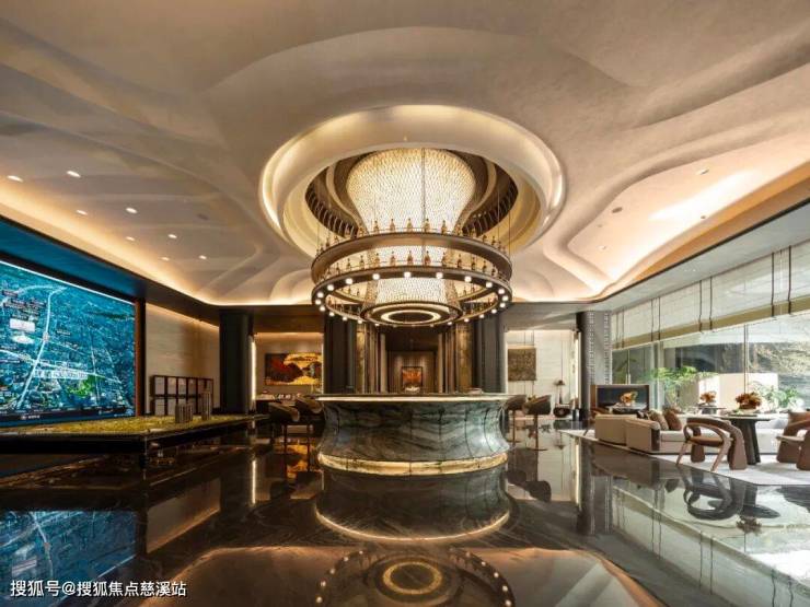 从门口的水系景观开始,大块的花岗岩石材、成吨玉曼米黄奢石整石切割的喷泉水景、从大堂到下沉式会所,更是使用了从墨染流云奢石、意大利超白洞奢石、波斯白玉奢石、维多利亚绿奢石、太古黑金石等众多价格昂贵的进口奢石。