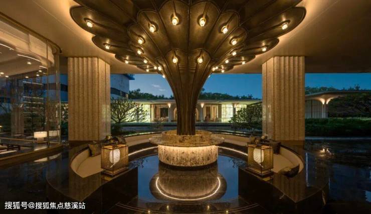 前场景观喷泉造型取自文冠花型(又名状元花),以玉曼米黄整石雕刻。地面铺装镌刻项目符号暗纹,嵌入铸铜细节,更添质感。