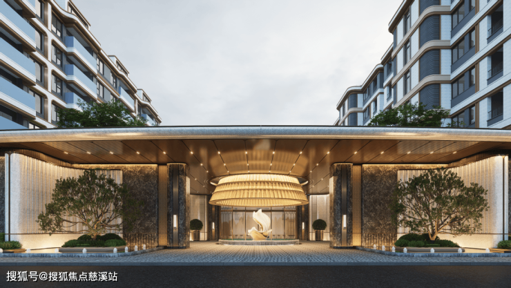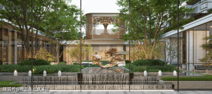 社区主入口位于地块西侧,以大尺度门头与两侧延展面凸显整体形象界面的品质感。内部三进空间,以中央雕塑与艺术装置形成中岛,配合大面积石材与地面铺装、金属格栅与线条运用凸显品质感。会所区域围合的景观庭院以精致闲适风格为主,景观游廊与林下休憩空间,水景小品与微地形高差处理形成的功能分区,细节丰富。