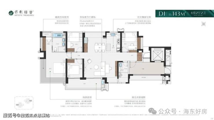 - 143㎡4+1房二卫(横厅绝版):首推1-2栋05户,位于小区中心,约13㎡专梯入户空间可灵活改造。LDKB横厅开间超10米,无过道浪费,动区开阔;阳台外飘设计,低区可看小区立体花园与街心公园,高区可侧览海景,目前已彻底售罄,后续无补推。