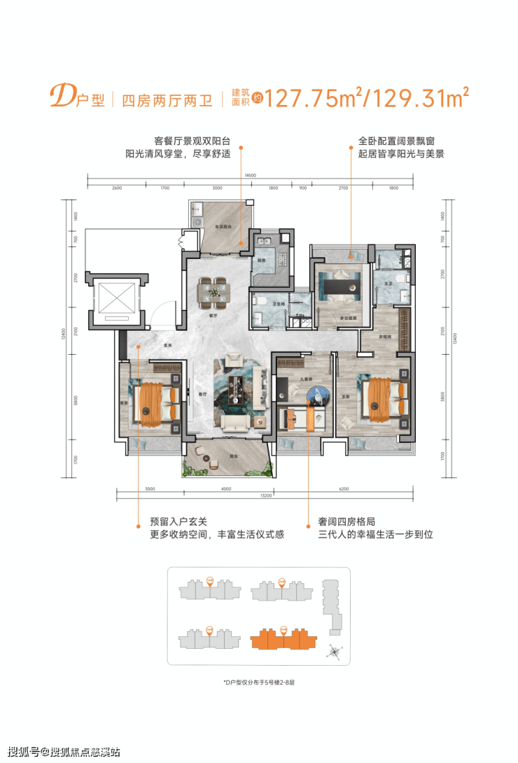 打造舒适南向面宽尺度,约4*4m宽阔客厅,容纳更多生活场景,演绎幸福生活,亲朋好友相聚共迎佳节、三代同堂天伦之乐,从此无忧。