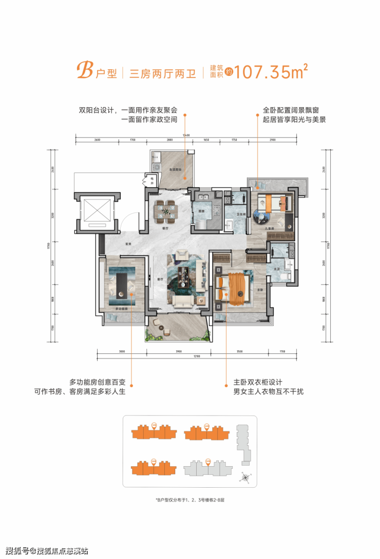 采用纯板式和双板连体的建筑设计,实现超大南向面宽效果使户型进深缩短,保证室内空间绝佳的通透采光,实现居住的最大舒适度。