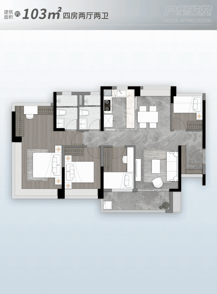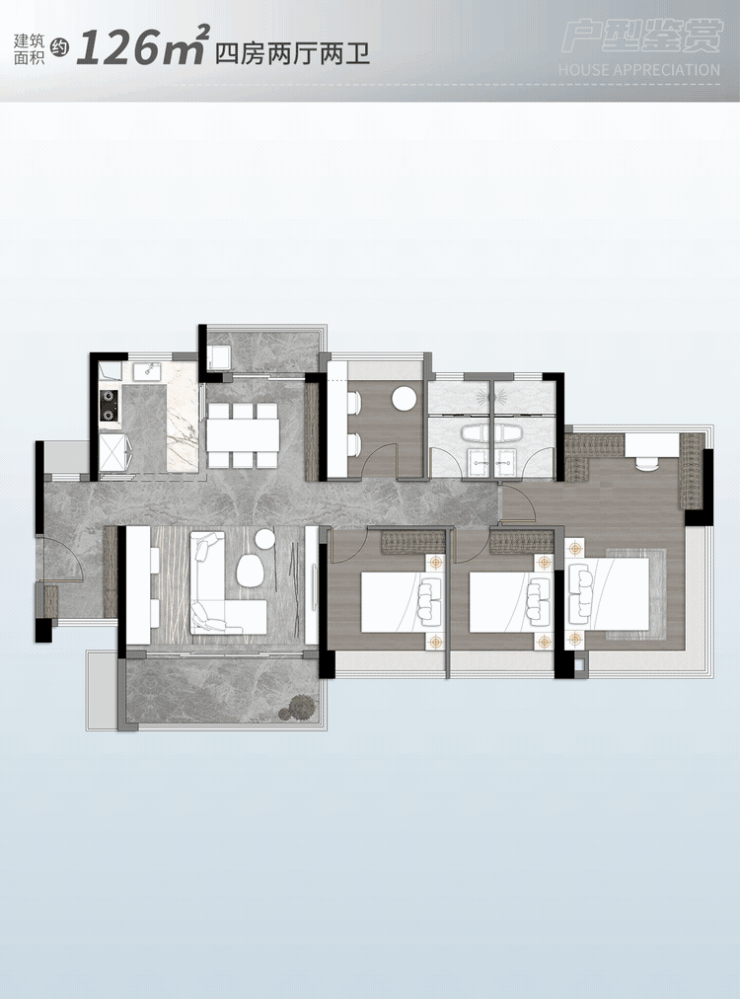 126㎡四房2厅2卫,五开间朝南约 15.4m采光,南北双阳台