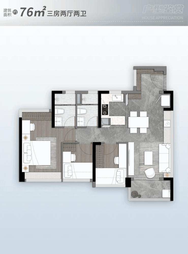 户型亮点:全南向开间、主卧套间设计、多飘窗赠送、动静分区,兼顾实用性与舒适度,适配三口之家、二胎家庭、三代同堂等多种家庭结构。