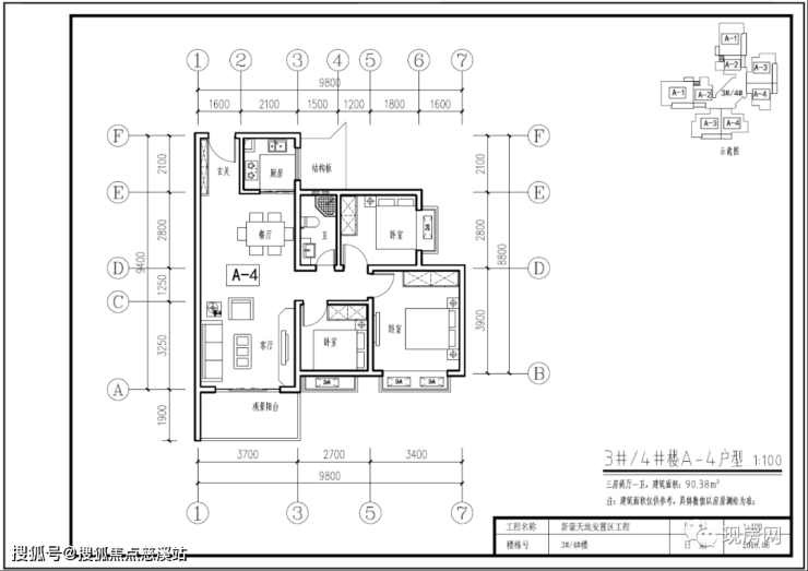 3#、4#号楼A4户型90.38㎡(三房两厅一卫)