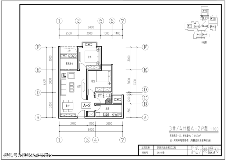 3#、4#号楼A2户型71.57㎡(两房两厅一卫)