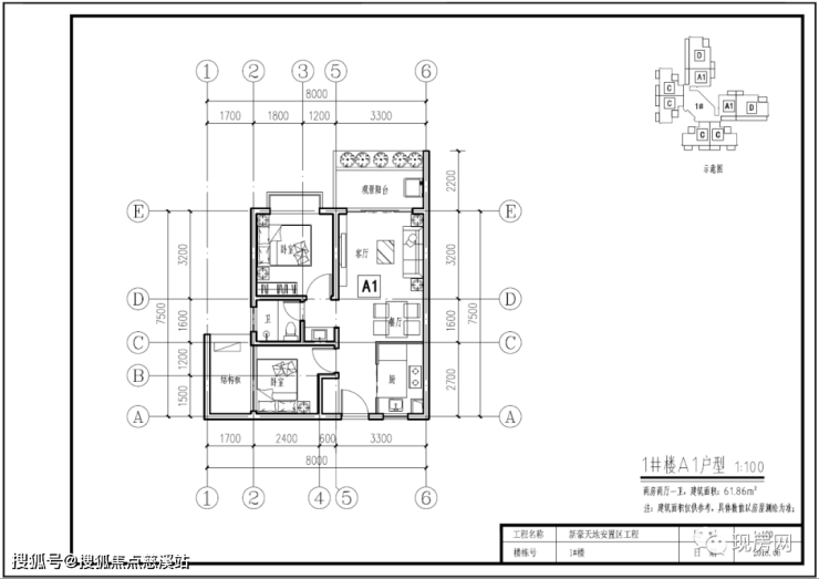 1#号楼A1户型61.86㎡(两房两厅一卫)