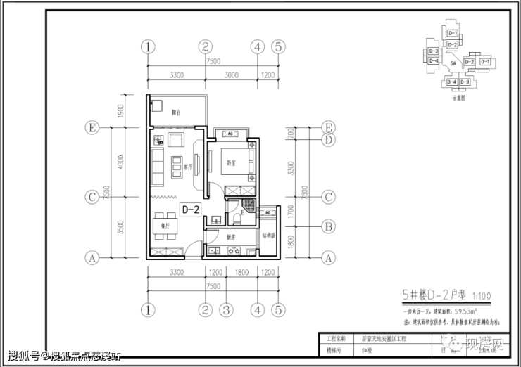 5#号楼D2户型59.53㎡(一房两厅一卫)