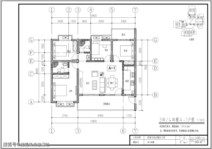 3#、4#号楼A1户型129.63㎡(四房两厅两卫)