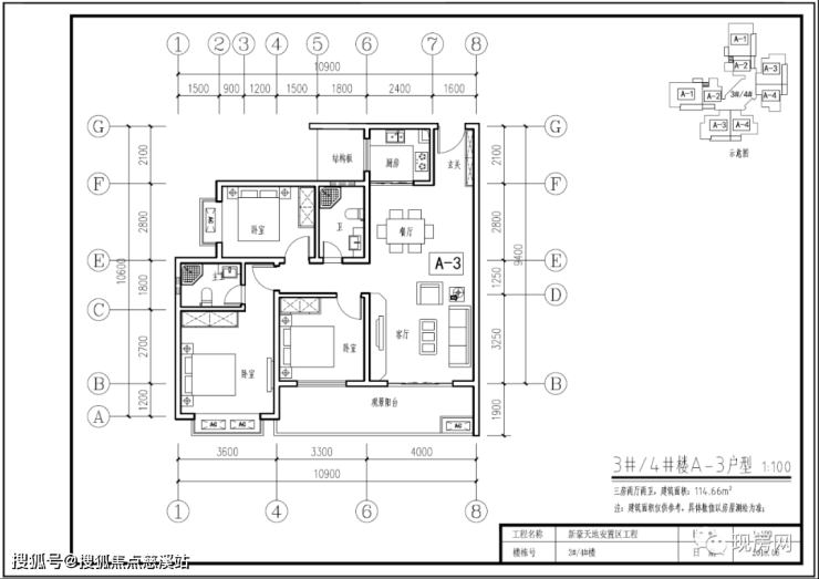 3#、4#号楼A3户型114.66㎡(三房两厅两卫)