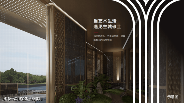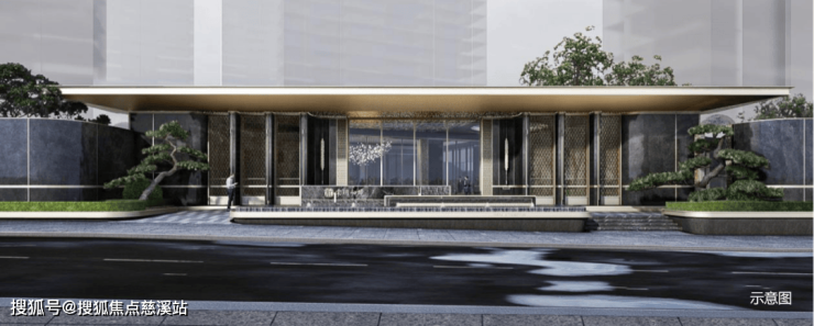 ※海派轻奢风格的酒店会所式入户大堂——高约6m,横向延展约32m,外立面采用石材和香槟色铝板,顶部星空顶,加上入口迎客松,让回家之路更具迎宾的仪式感。