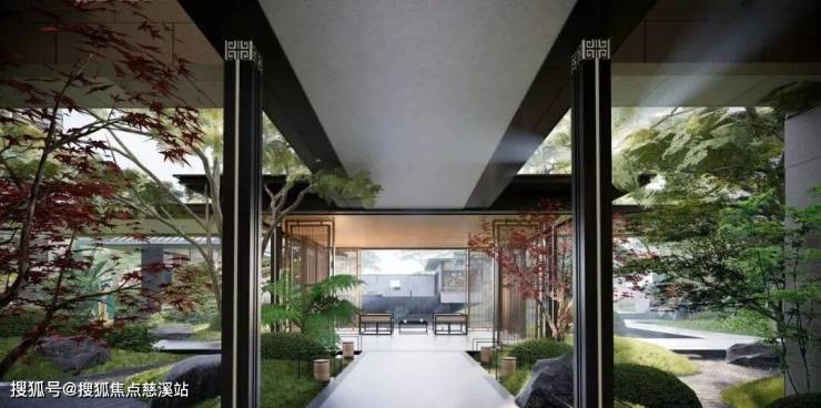 一进山水院,以叠石奇景,精巧花木为主,赋山形,观山语,呈现了一种如居山中的归家体验。二进镜水院,以水景、曲桥、角亭为主,呈现了符合中式生活特色的园林空间。