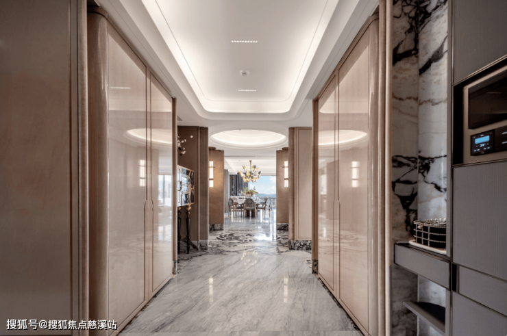 一梯一户的私享化电梯前厅,以瓷砖拼花和稀贵岩板打造品质与奢华感;八合一智能门锁装甲子母门,以2.4米的高度和1.5米的宽度,则带来匹配西湖家族的尺度感。