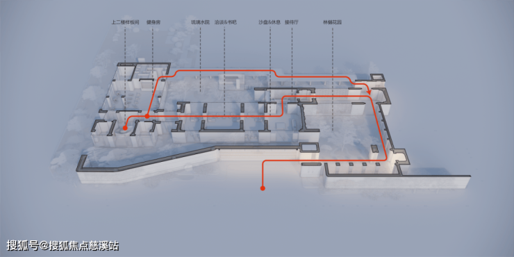 展示区总图采用非对称游廊式布局,横向展开的环绕式动线,强化曲径通幽的空间层次;室内外浑然一体,相互穿插交融,结合主要归家节点设置所见即所得的全景展示区。
