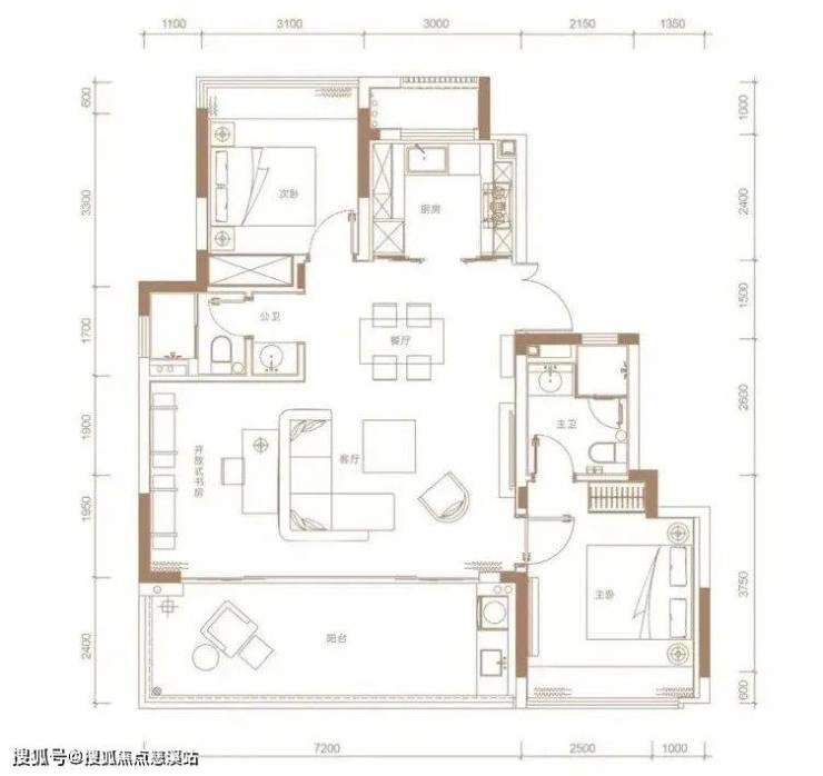 112㎡2+1房设计,进门就是餐厅,北侧是U型厨房,南侧是客厅,客厅若打通书房,开间达7.2米,搭配等宽阳台,主卧套房为南向,带270°大飘窗。