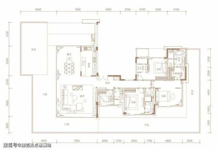 242㎡三套房设计,动静分区,玄关进来,就是多功能房,右侧是三间套房,左侧为LDKG一体化公区,很大气,最大看点是带270°全景环幕露台。