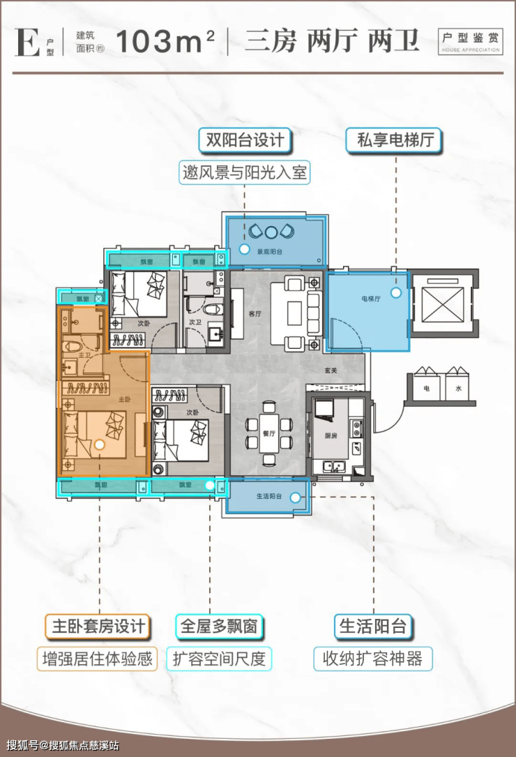 该户型入户玄关、双阳台、全屋多飘窗、套房式主卧等设计拓展了生活的空间,将功能性与舒适性完美结合,增强了居住体验感,这个面积段能做出这样的设计很难得。