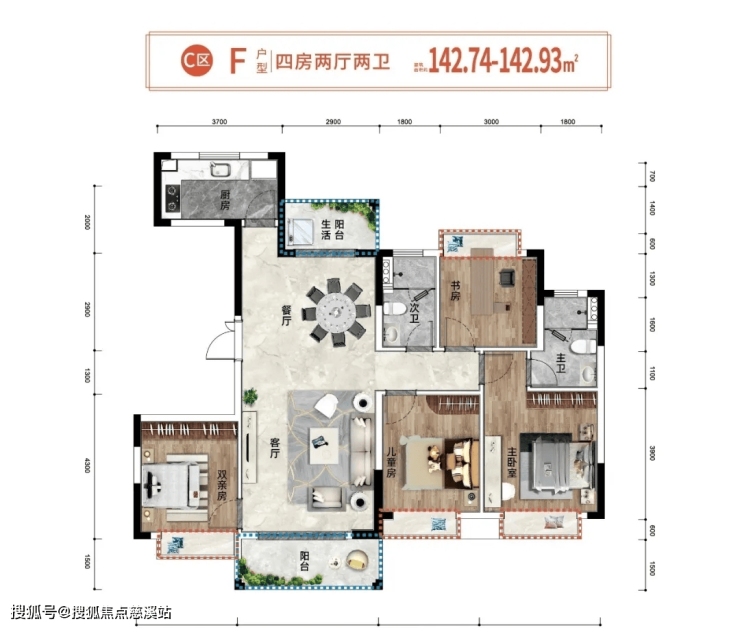🏖F户型约142.93㎡(四房两厅两卫)